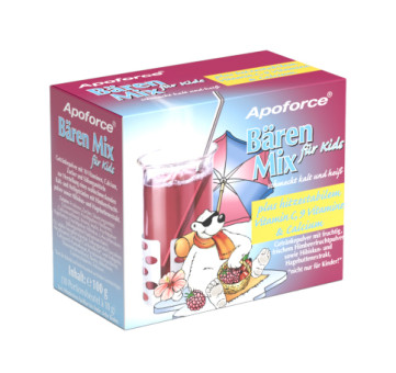 Fruktose, Zucker, Citronensäure (Säuerungsmittel), Fruchtpulver Himbeere, Calciumcarbonat, Aroma, Inulin, Fruchtpulver Hagebutten, Fruchtpulver Hibiskus, L-Ascorbinsäure, Natriumsaccharin (Süßungsmittel), D,L-alpha-Tocopherylacetat, Sucralose (Süßungsmittel), Nicotinamid, Cochenillerot* und Indigotin (Farbstoff), Calcium-D-Pantothenat, Pyridoxinhydrochlorid, Thiaminhydrochlorid, Biotin, Riboflavin, Cyanocobalamin, Folsäure.