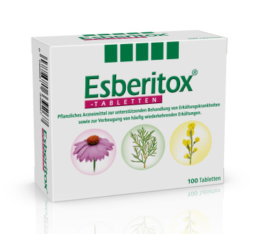 Esberitox®-Tabletten sind ein pflanzliches Arzneimitel zur unterstützenden Behandlung von Erkältungskrankheiten sowie zur Vorbeugung von häufig wiederkehrenden Erkältungen. In Esberitox® sind die pflanzlichen Wirkstoffe Lebensbaum, Färberhülse und Sonnenhut kombiniert, sodass sich ihre positiven Eigenschaften perfekt ergänzen, und sie ihre medizinische Wirkung voll entfalten können. Der Esberitox®-Effekt: Die Erkältungssymptome werden effektiv gelindert und bessern sich bereits ab dem 2. Tag1,2, die Erkältungsdauer wird um bis zu 3 Tage verkürzt1. Frei von Gluten und zudem vegan. Für Kinder ab 4 Jahren geeignet.