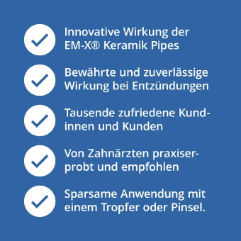 Aufgrund der antioxidativen Wirkung der enthaltenen EM-X® Keramik Pipes werden schädliche oxidative Vorgänge bei Entzündungen gelindert. Die feinenergetischen Resonanzen der EM-X® Keramik Pipes sorgen für eine gesunde und stabile Mundflora.