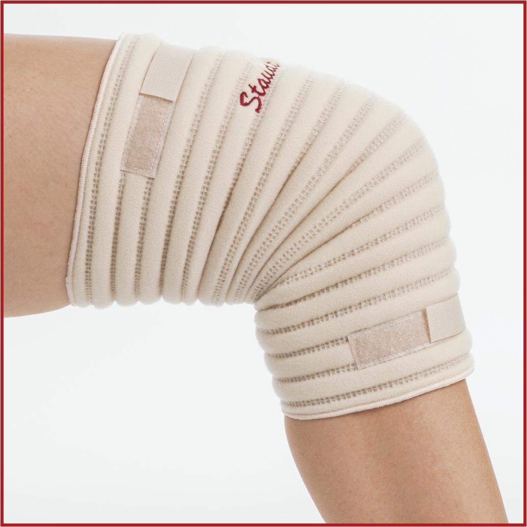 Die sehr häufigen abnützungsbedingten Kniebeschwerden (Arthrosen), und auch die chronischen Sportverletzungen und Beschwerden anderer Ursachen, sprechen sehr gut auf STAUDT-Therapie-Manschetten an. Patienten, die schon jahrelang unter den Arthrose-Schmerzen litten, konnten mit STAUDT-Knie-Manschetten ihre Beschwerden sogar ganz wegbekommen - und das einfach während der NACHT, ohne Belastung durch Medikamente, ohne großen Aufwand. Die Knie-Manschetten werden immer paarweise getragen, um über eine therapeutische Rückkoppelung durch die Reflexbögen des Rückenmarks, eine verbesserte Wirkung zu erzielen, und um das durch Schonhaltung gefährdete gesunde Gelenk besonders zu schützen. Verwenden Sie zusätzlich zur Gelenkpflege 2-mal täglich das STAUDT-Gel mit den besonderen Wirkstoffen der neuseeländischen Grünlippmuschel, um den Effekt der Manschetten zu verbessern. Die Knie-Manschetten werden wie ein Strumpf angezogen und mit Klettverschlüssen fixiert.