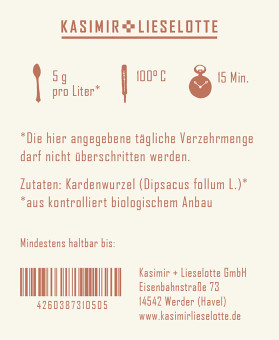 Vom Samen bis zum fertigen Naturprodukt finden alle Arbeitsschritte für unseren Kardenwurzel-Tee direkt bei Kasimir + Lieselotte statt. Die Kardenwurzeln werden auf unserem eigenen Acker in Brandenburg angebaut, in sorgsamer Handarbeit kultiviert und zu unseren erstklassigen Karde-Produkten verarbeitet. Auf den Einsatz von Chemikalien oder Zusatzstoffen verzichten wir aus Überzeugung.