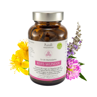 Grundsätzlich wird eine ausreichende Versorgung mit B-Vitaminen auch während der Wechseljahre empfohlen. Daher wurden für unser Reife-Wunder speziell die Vitamine B6, Folat (B9) und B12 ausgewählt.