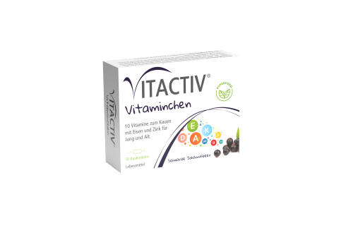 Vitactiv® Vitaminchen sind zuckerhaltige Kaubonbons mit Geschmack nach schwarzer Johannisbeere für Jung und Alt, angereichert mit 10 Vitaminen (A, B1, B2, B3 (Niacin), B6, B12, C, D, E & Folsäure), Eisen und Zink.