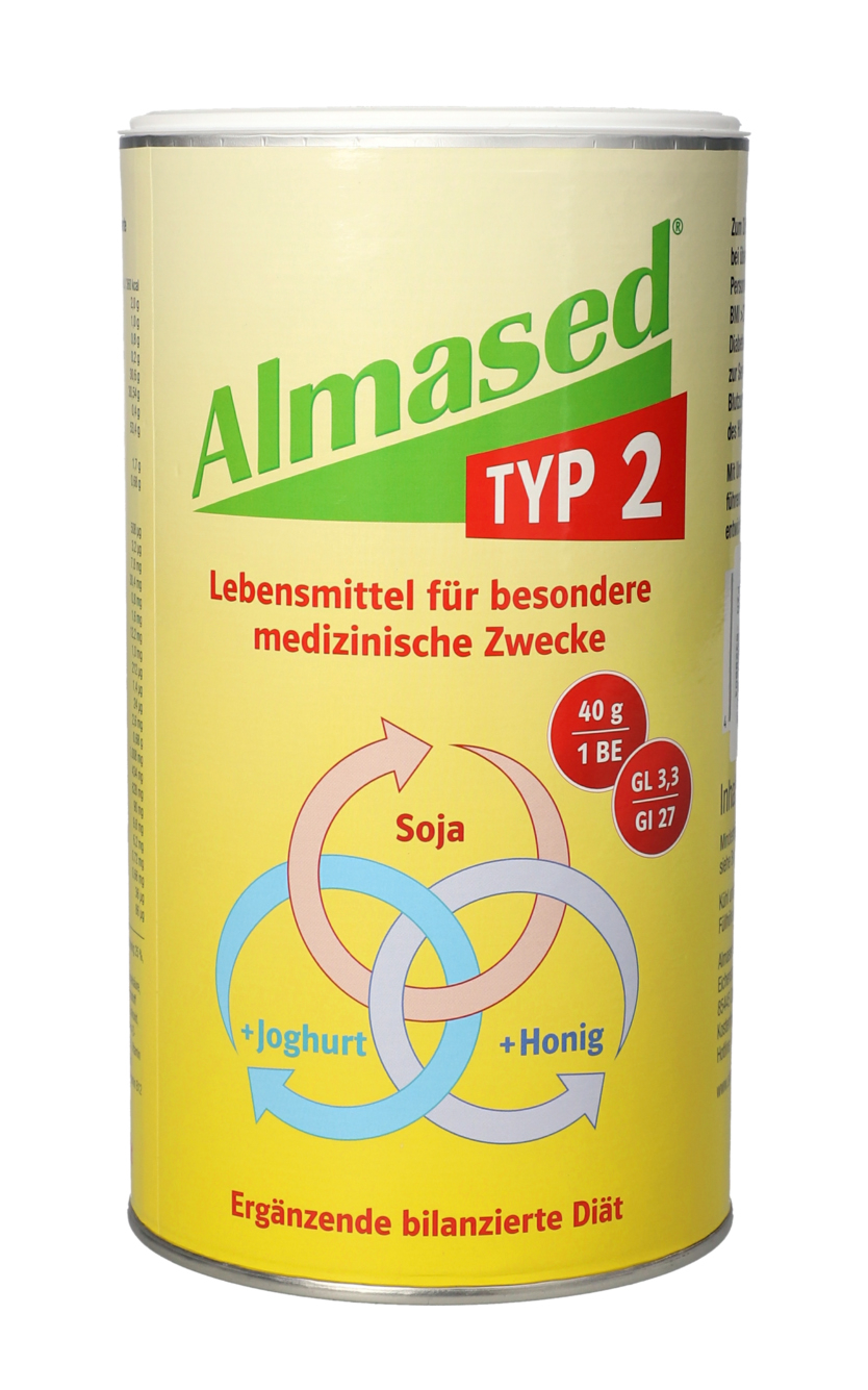 Almased® Typ 2 ist ein Lebensmiitel für besondere medizinische Zwecke (Ergänzende bilanzierte Diät) zum Diätmanagement bei übergewichtigen Personen mit einem BMI >27, die an Diabetes Typ 2 leiden, zur Senkung des Blutzuckerspiegels und de sHbA1c-Werts.